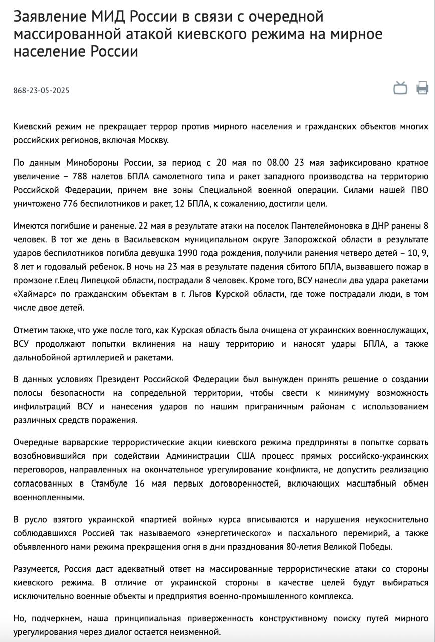 Налеты дронов МИД считает попыткой "сорвать возобновившийся при содействии администрации США процесс прямых российско-украинских переговоров".