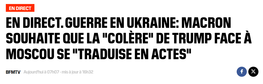 "Думаю, президент Трамп понимает, что когда президент Путин сказал, что готов к миру, он ему солгал... В последние часы мы вновь стали свидетелями проявления гнева Дональда Трампа. Это своего рода нетерпение. Теперь я просто хочу, чтобы это вылилось в конкретные действия", - сказал президент Франции.