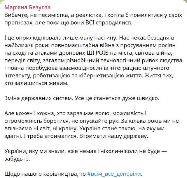 "Нас ждет бездна в ближайшие годы: полномасштабная война с продвижением россиян на востоке и атаками дроновых ИИ-роев на города... Украины, которую мы знали, уже нет и никогда не будет – забудьте", – написала нардеп.
