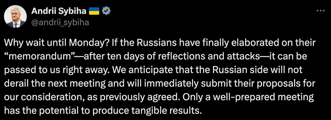 Глава украинского Министерства иностранных дел Андрей Сибига вслед за министром обороны Рустемом Умеровым предложил, чтобы РФ передала свой меморандум Украине немедленно.