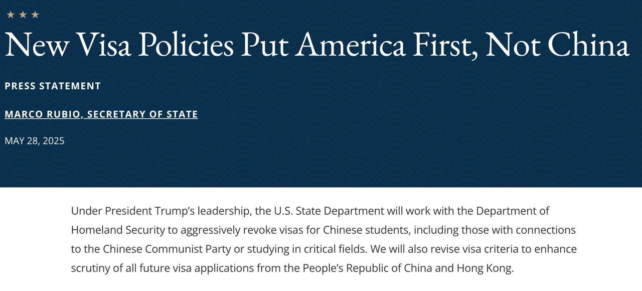 Государственный секретарь США Марко Рубио объявил, что США начнут "решительно отзывать визы у китайских студентов".