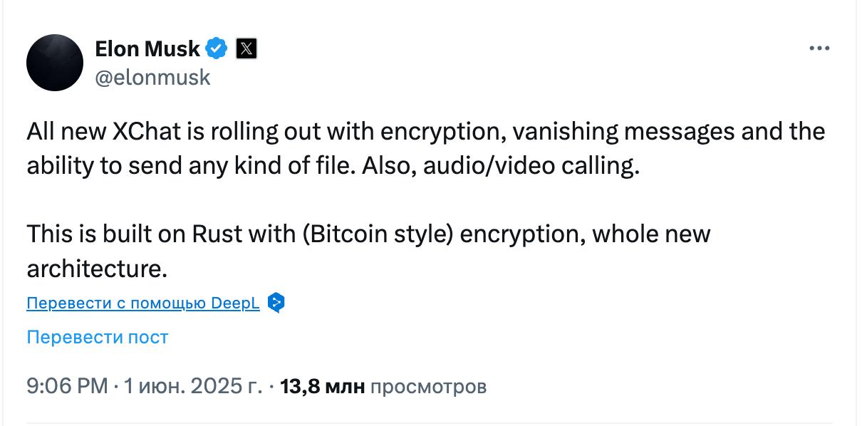 Маск представил новый мессенджер "XChat", встроенный в соцсеть Х