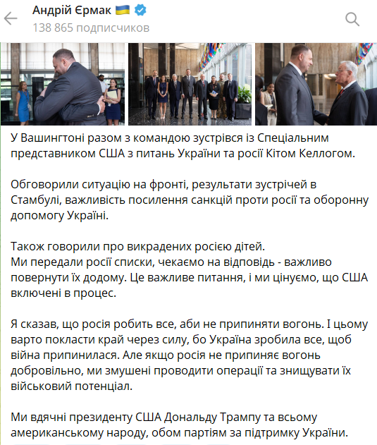 Глава Офиса президента (ОП) Андрей Ермак в Вашингтоне встретился со специальным представителем США по Украине Китом Келлогом.