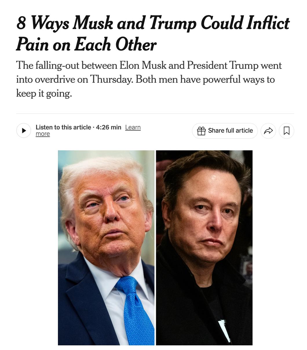 В ответ NYT перечисляет потенциальные шаги, которые может предпринять Трамп: разрыв контрактов с компаниями Маска, лишение его допуска к секретной информации, давление через Министерство юстиции, в том числе возможное расследование его иммиграционного статуса и употребления наркотиков.
