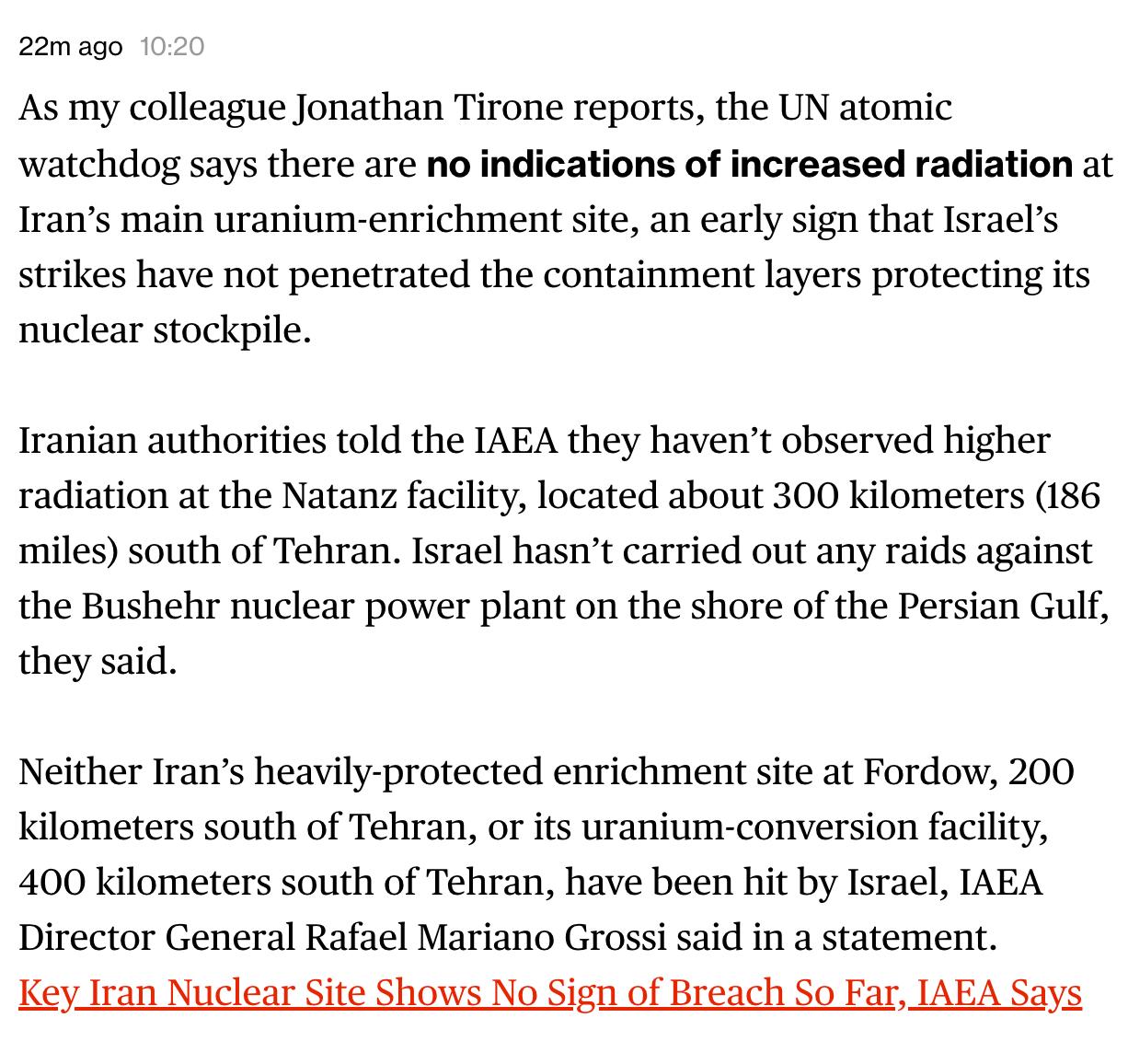 По данным издания, на главном иранском объекте по обогащению урана нет признаков повышенной радиации, что было бы первым признаком успеха ударов.