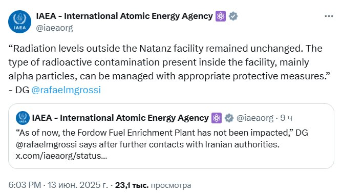 Днем в МАГАТЭ заявили, что пока не видят признаков того, что удары Израиля сумели поразить ядерные объекты Ирана, которые находятся глубоко под землей.
