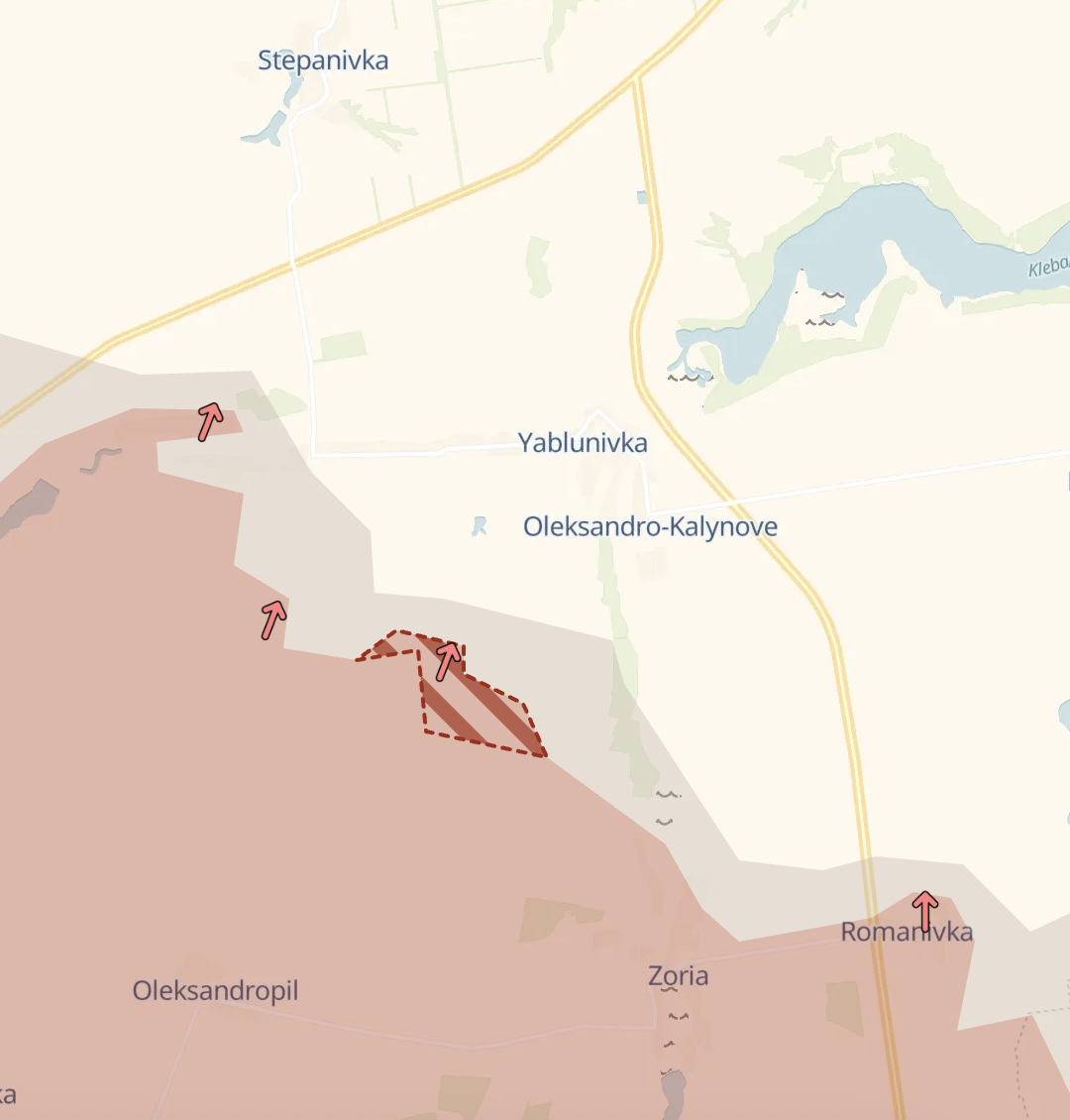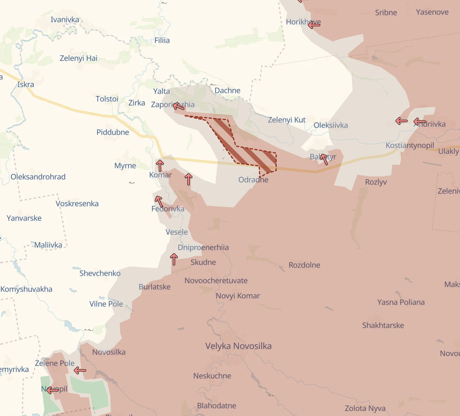 По мнению Машовца здесь российские войска двигаются в сторону села Запорожье и пытаются вытеснить украинские силы из Алексеевки, расположенной на противоположном берегу реки Волчья (паблики РФ и некоторые украинские военные говорят, что Алексеевка полностью захвачена, но Deep State помещает ее в "серую зону").