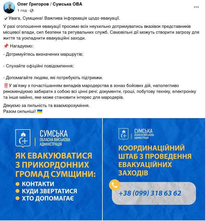 "Официально заявляем: такая информация не соответствует действительности. Подобная публикация не появлялась ни на официальных страницах начальника ОГА Олега Григорова, ни на ресурсах Сумской областной военной администрации. Это очередной информационный вброс врага, направленный на усиление паники, дестабилизацию приграничного региона и подрыв доверия к власти", - говорится в сообщении ОВА.
