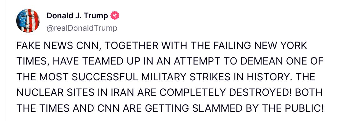 "Фейковые новости CNN вместе с находящейся в упадке New York Times объединились, пытаясь принизить одну из самых успешных военных операций в истории. Ядерные объекты в Иране полностью уничтожены. И Times, и CNN получают шквал критики от общественности", - написал президент США в своей соцсети Truth Social.