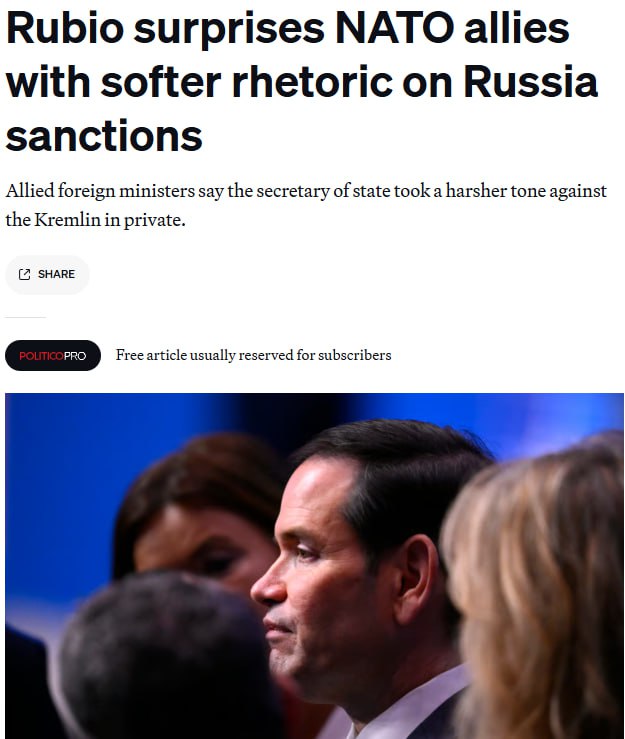 "Во время вечерней беседы во вторник на частном ужине, посвященном Украине, Рубио намекнул, что Сенат, скорее всего, займется вопросом усиления санкций против России после того, как завершит работу над налоговой и бюджетной инициативой президента Дональда Трампа", – сообщает издание со ссылкой на четырех неназванных европейских дипломатов.