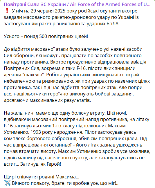 Сегодня ночью, отбивая массированную воздушную атаку РФ, на самолете F-16 погиб лётчик 1-го класса подполковник Максим Устименко, 1993 года рождения.