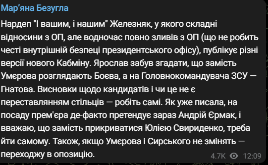 "Как уже писала, на должность премьера де-факто претендует сейчас Андрей Ермак, и считаю, что вместо того, чтобы прикрываться Юлией Свириденко, нужно идти самому. Также если Умерова и Сырского не изменят - перехожу в оппозицию", - заявила Безуглая.