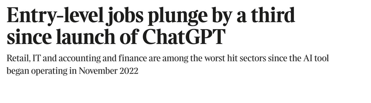 На сайте по поиску работы Adzuna количество вакансий для выпускников, стажеров, интернов и младших специалистов без требования высшего образования сократилось на 31,9% с ноября 2022 года, когда был запущен этот ИИ-сервис.