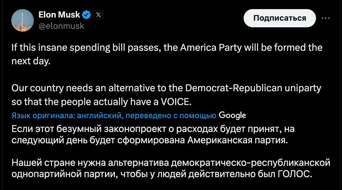 "Если этот безумный законопроект о расходах будет принят, на следующий день будет сформирована Американская партия. Нашей стране нужна альтернатива демократическо-республиканской однопартийной партии, чтобы у людей действительно был голос", - написал Маск в своей социальной сети X.