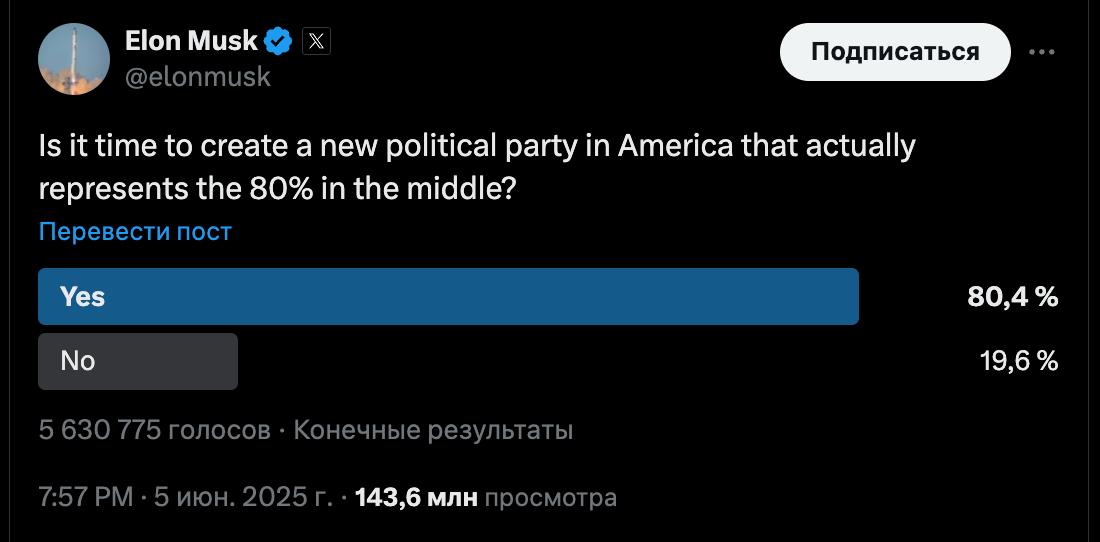 Он также провел опрос на своей странице в соцсети Х, где 80% высказались за создание такой партии.