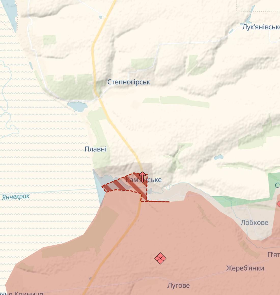 На карте украинского военного паблика указано существенное продвижение в Каменском (кратчайшая дорога на Запорожье). По сути подтверждая данные российских пабликов о заходе в это село.