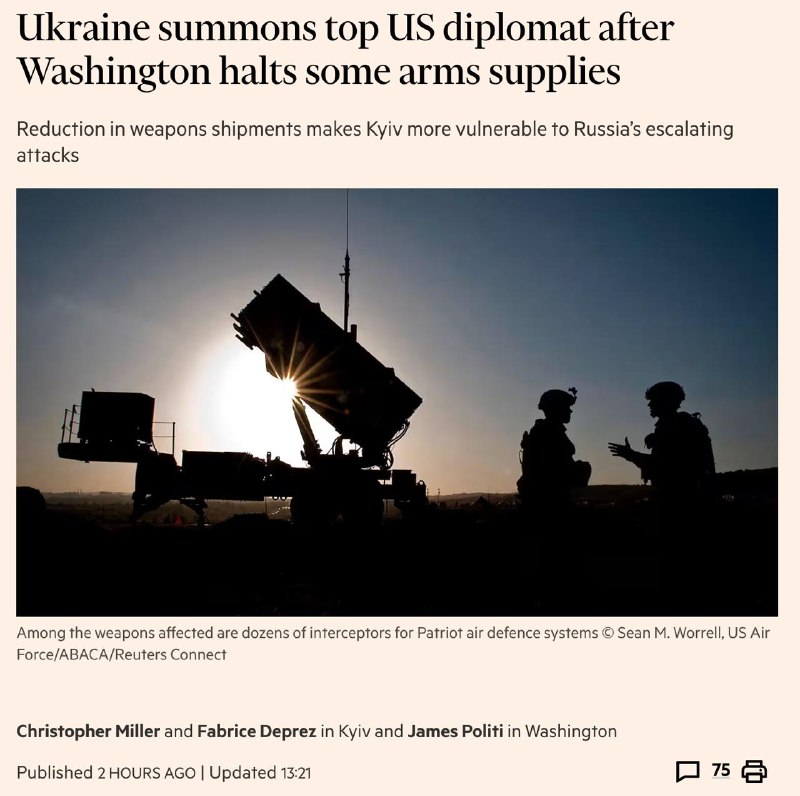 Financial Times перечисляет, что не получила Украина: перехватчики PAC-3 для систем ПВО Patriot, десятки переносных зенитных ракетных комплексов Stinger, более 100 ракет Hellfire и ракеты AIM, запускаемые украинскими истребителями F-16, противотанковые системы, включая гранатомет AT4, и около 250 снарядов управляемой реактивной системы залпового огня GMLRS, используемых для точного поражения наземных целей на больших расстояниях.