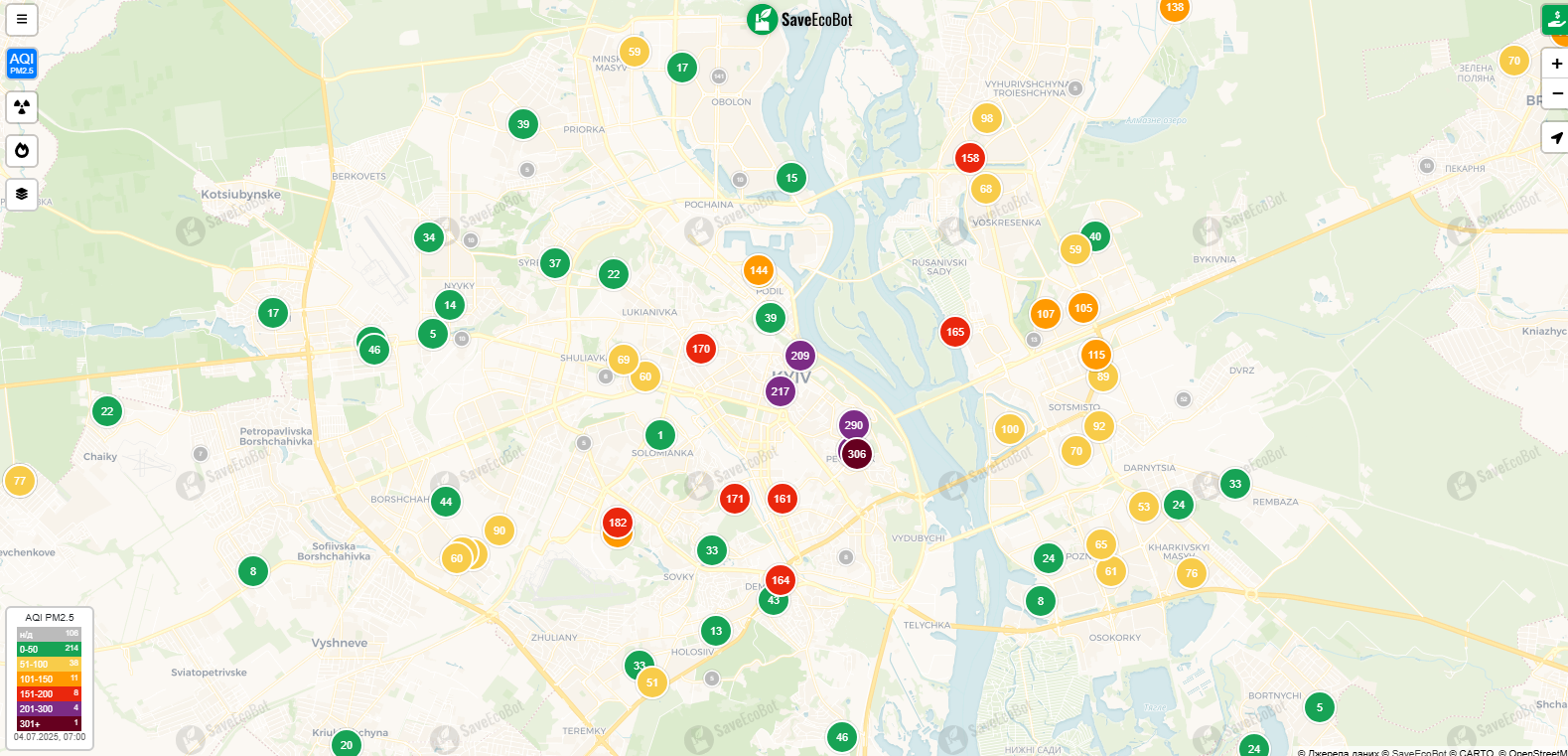 В некоторых местах индекс качества воздуха (AQI) превышает допустимые нормы в несколько раз. Согласно карте, самая плохая ситуация - в центре, на Левом берегу и вблизи аэропорта "Борисполь" - в некоторых местах индекс AQI показывает 306.
