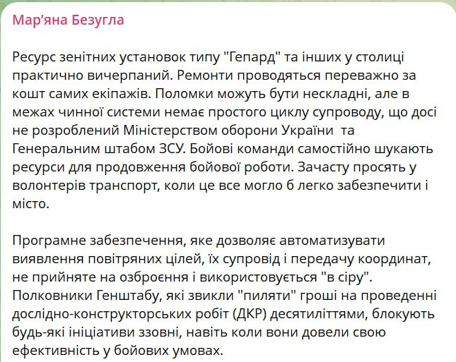 Безуглая утверждает, что военные за свой счет ремонтируют зенитки, а ресурс оружия почти исчерпан