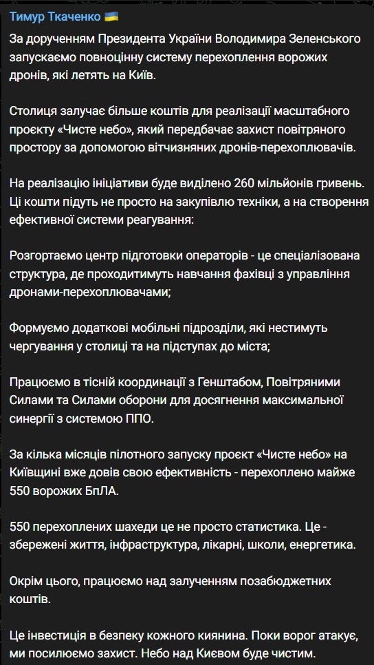 Проект называется "Чистое небо", на него потратят 260 миллионов гривен. Он уже работает несколько месяцев в пилотном режиме и перехватил под 550 "Шахедов".