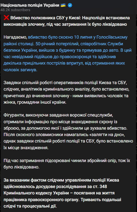 Убийцами полковника СБУ в Киеве были иностранцы, заявляет Нацполиция.