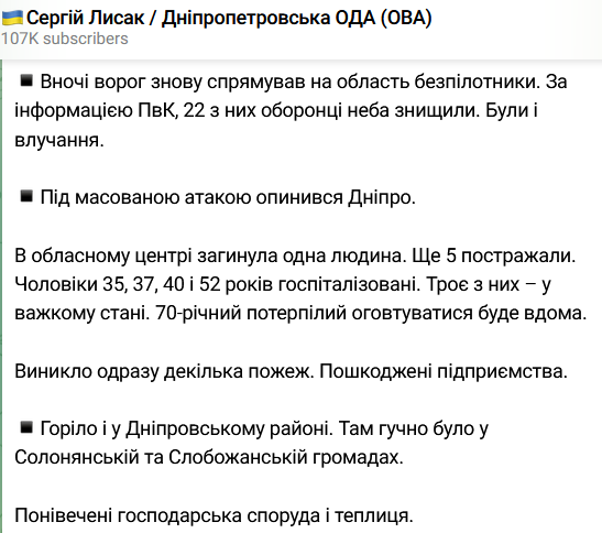 В ночь на 17 июля под массированной атакой "Шахедов" оказался Днепр. В городе возникло несколько пожаров, повреждены предприятия. Погиб один человек, ещё пятеро пострадали.