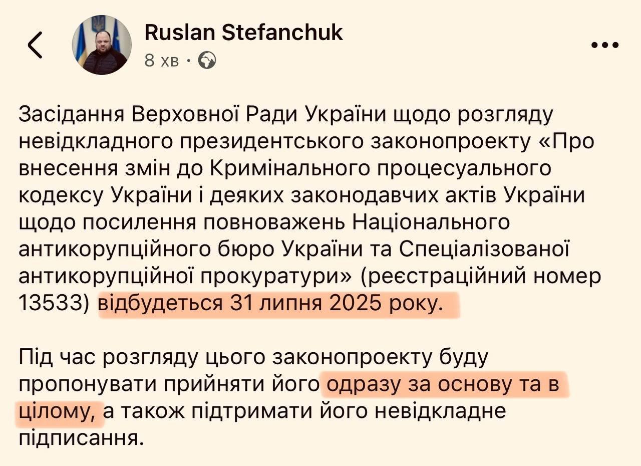 "Заседание Верховной Рады Украины по рассмотрению неотложного президентского законопроекта "О внесении изменений в Уголовный процессуальный кодекс Украины и некоторые законодательные акты Украины относительно усиления полномочий Национального антикоррупционного бюро Украины и Специализированной антикоррупционной прокуратуры" (регистрационный номер 13533) состоится 31 июля 2025 года", - написал он.