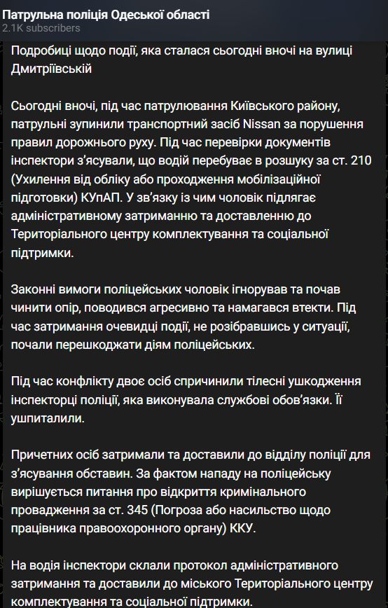 Сегодня ночью в Одессе избили инспектора полиции во время задержания мужчины для доставления его в Территориальный центр комплектования и социальной поддержки.