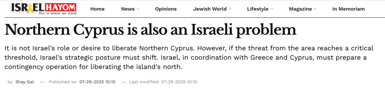 "Если угроза с этой территории достигнет критического уровня, Израиль совместно с Грецией и Кипром должен подготовить план действий на случай освобождения северной части острова. Такая операция позволила бы нейтрализовать возможности Турции перебрасывать подкрепления с материка, уничтожить системы ПВО на Северном Кипре, ликвидировать центры разведки и управления и, наконец, вывести турецкие войска, восстановив международно признанный суверенитет Кипра", - пишет Галь.