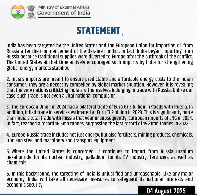"На этом фоне давление на Индию является необоснованным и несправедливым. Как и любая крупная экономика, Индия примет все необходимые меры для защиты своих национальных интересов и экономической безопасности", - заявляет МИД.