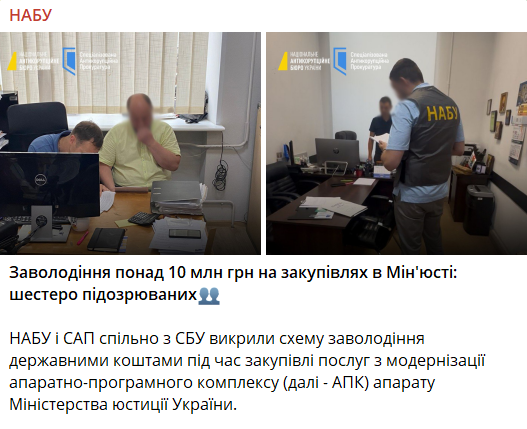 По версии следствия, в 2021 году сотрудники Минюста закупили оборудование через частную компанию по многократно завышенным ценам, заплатив за контракт 19 миллионов гривен и переплатив из них десять.