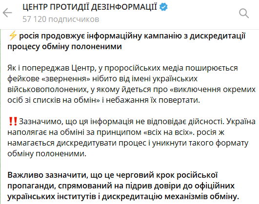 "Эта информация не соответствует действительности. Украина настаивает на обмене по принципу "всех на всех". Россия же пытается дискредитировать процесс и избежать такого формата обмена пленными", – говорится в сообщении.