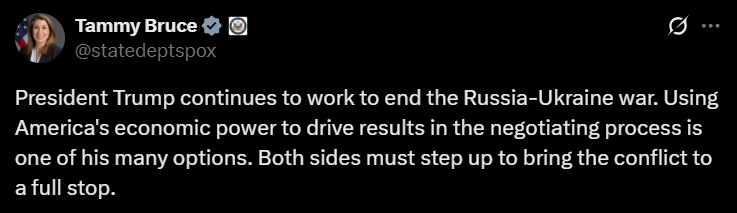 "Президент Трамп продолжает работать над прекращением российско-украинской войны. Использование экономической мощи Америки для достижения результатов в переговорном процессе - один из его многочисленных вариантов. Обе стороны должны активизировать усилия, чтобы полностью положить конец конфликту", - написала спикер Госдепа.
