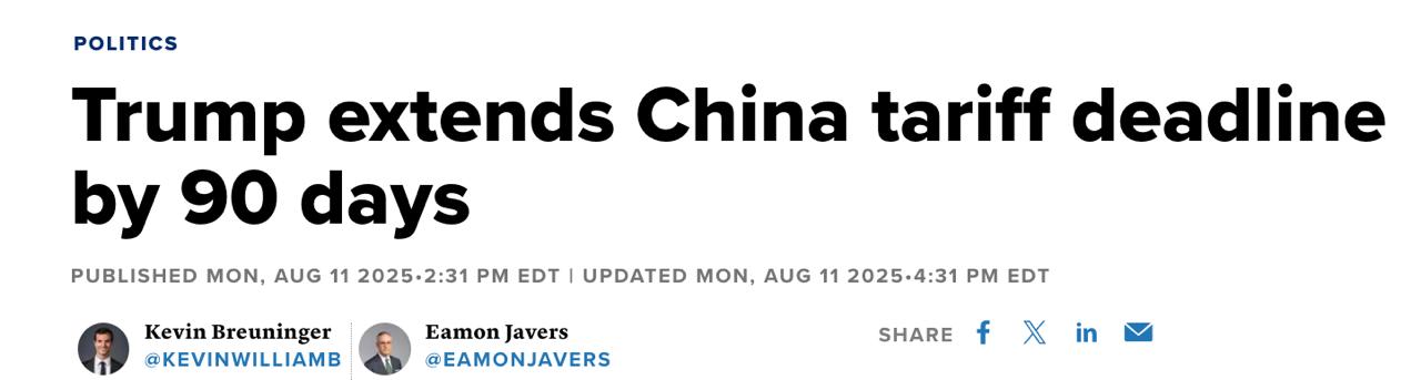 Указ ввели в действие за несколько часов до истечения крайнего срока, отведённого Трампом для торговых переговоров между Вашингтоном и Пекином - в ночь на вторник, 12 августа.