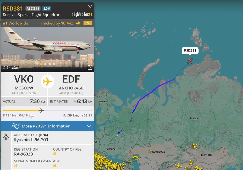 Между тем из Москвы в Анкоридж отправился спецборт Ил-76. Телеграм-каналы предположили, что это Путин уже летит на завтрашнюю встречу с Трампом, но государственное издание ТАСС уточнило, что на борту может находиться одна из передовых групп, занимающихся подготовкой саммита.