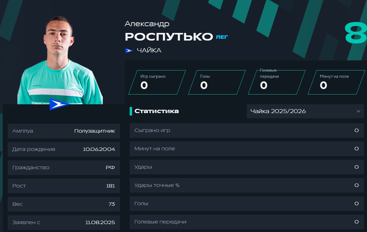 В профиле полузащитника указано гражданство России и членство в команде из села Песчанокопского Ростовской области. При этом "Чайка" официально не объявляла о подписании контракта с Роспутько и на её официальном сайте среди игроков он не значится.