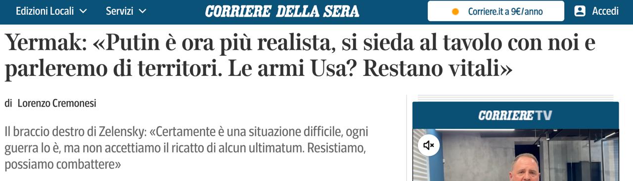 "Зеленский ясно дал понять: все территориальные вопросы будут обсуждаться на его двусторонней встрече с Путиным; более того, переговоры должны начинаться с нынешней линии фронта, и в любом случае мы не откажемся от наших национальных территорий. Мы признаем ситуацию, сложившуюся войной, и хотим её обсудить. В данный момент не намерены уступать ни одну часть нашей земли. Но сегодня мы реалисты и знаем, что агрессор оккупировал некоторые регионы, и пока мы не можем освободить их с помощью оружия", – сказал Ермак.