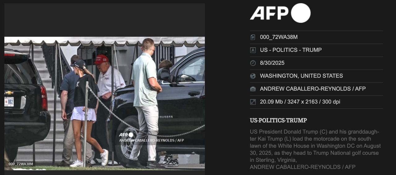 Новостное агентство AFP опубликовало сегодняшний кадр, как Трамп и его внучка Кай садятся в кортеж на южной лужайке Белого, направляясь в гольф-клуб.