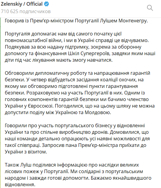 Об этом сообщил в своем телеграм-канале президент Украины Владимир Зеленский после разговора с премьер-министром Португалии Луишем Монтенегру.