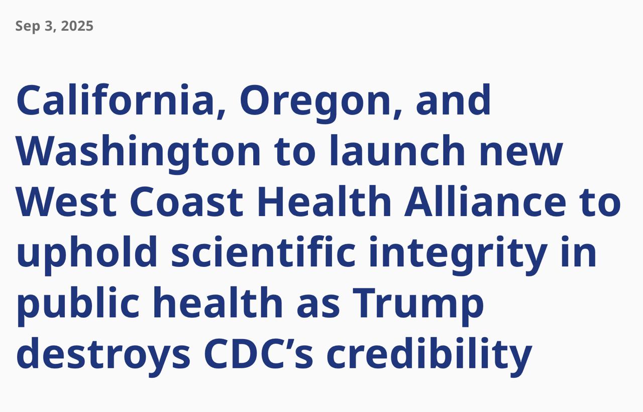 "В ответ на недавние действия федерального правительства, которые подорвали независимость CDC и вызвали обеспокоенность по поводу политизации науки, Калифорния, Орегон и Вашингтон начинают процесс предоставления своим жителям единых рекомендаций на основе фактических данных относительно того, кому следует делать прививки, а также для обеспечения доступа общественности к достоверной информации, которая позволит быть уверенным в безопасности и эффективности вакцин", - говорится в сообщении.
