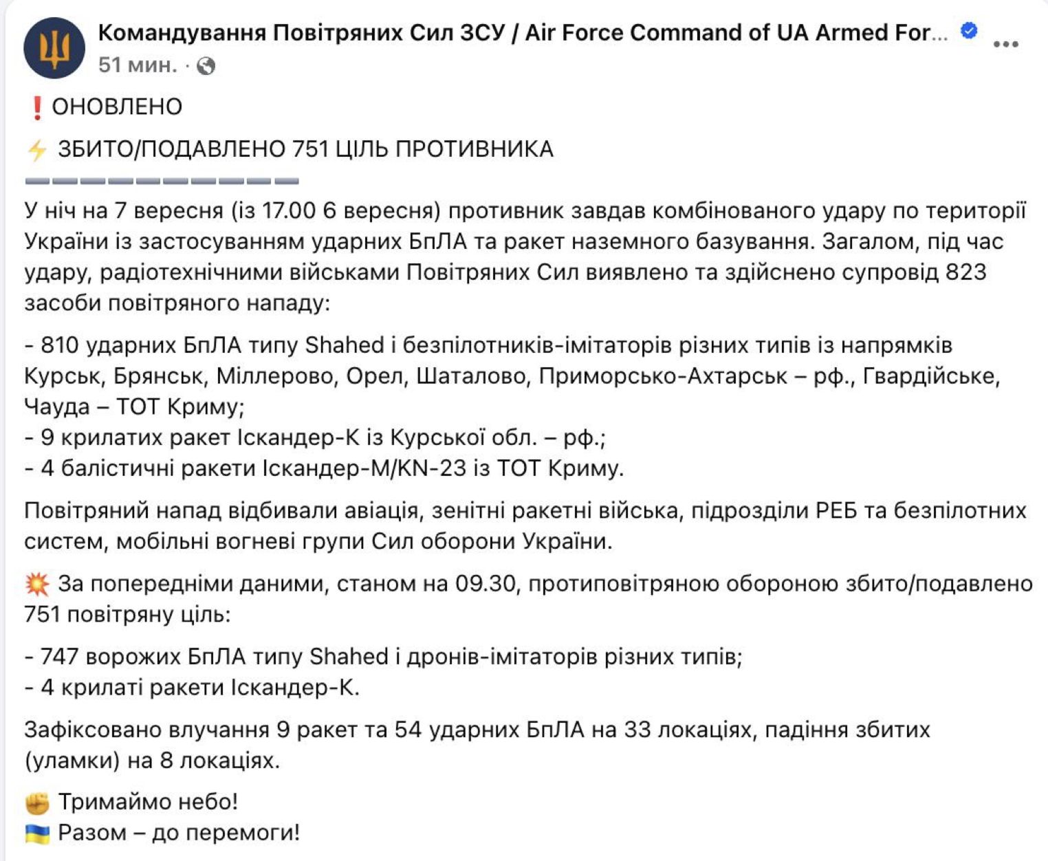 Также было запущено 13 ракет: 9 крылатых "Искандер-К" (сбито 4) и 4 баллистические "Искандер-М/KN-23" (все достигли целей).