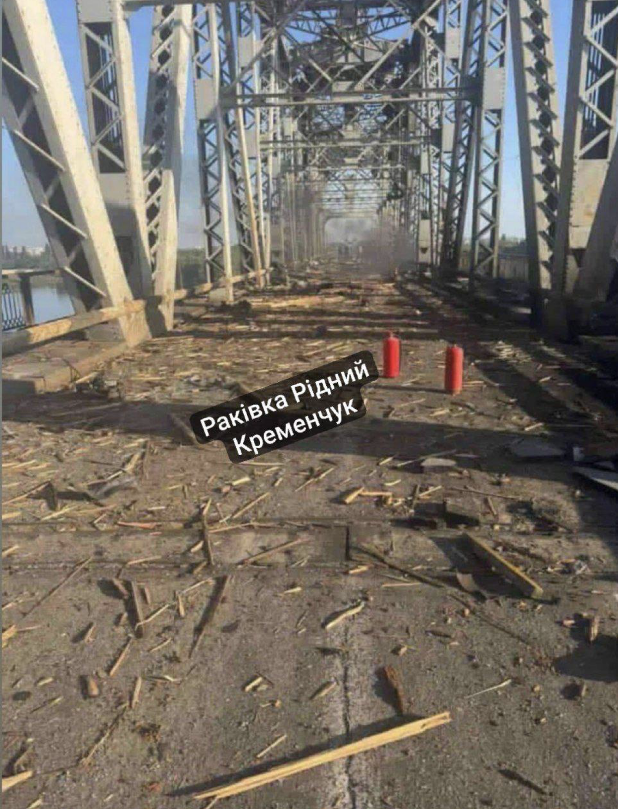 12:45 Член набсовета Укрзализныци и советник Офиса президента Сергей Лещенко перепубликовал в своем телеграмм-канале сообщение об ударе российского дрона по железнодорожному мосту в Кременчуге с видео удара и с фото последствий.