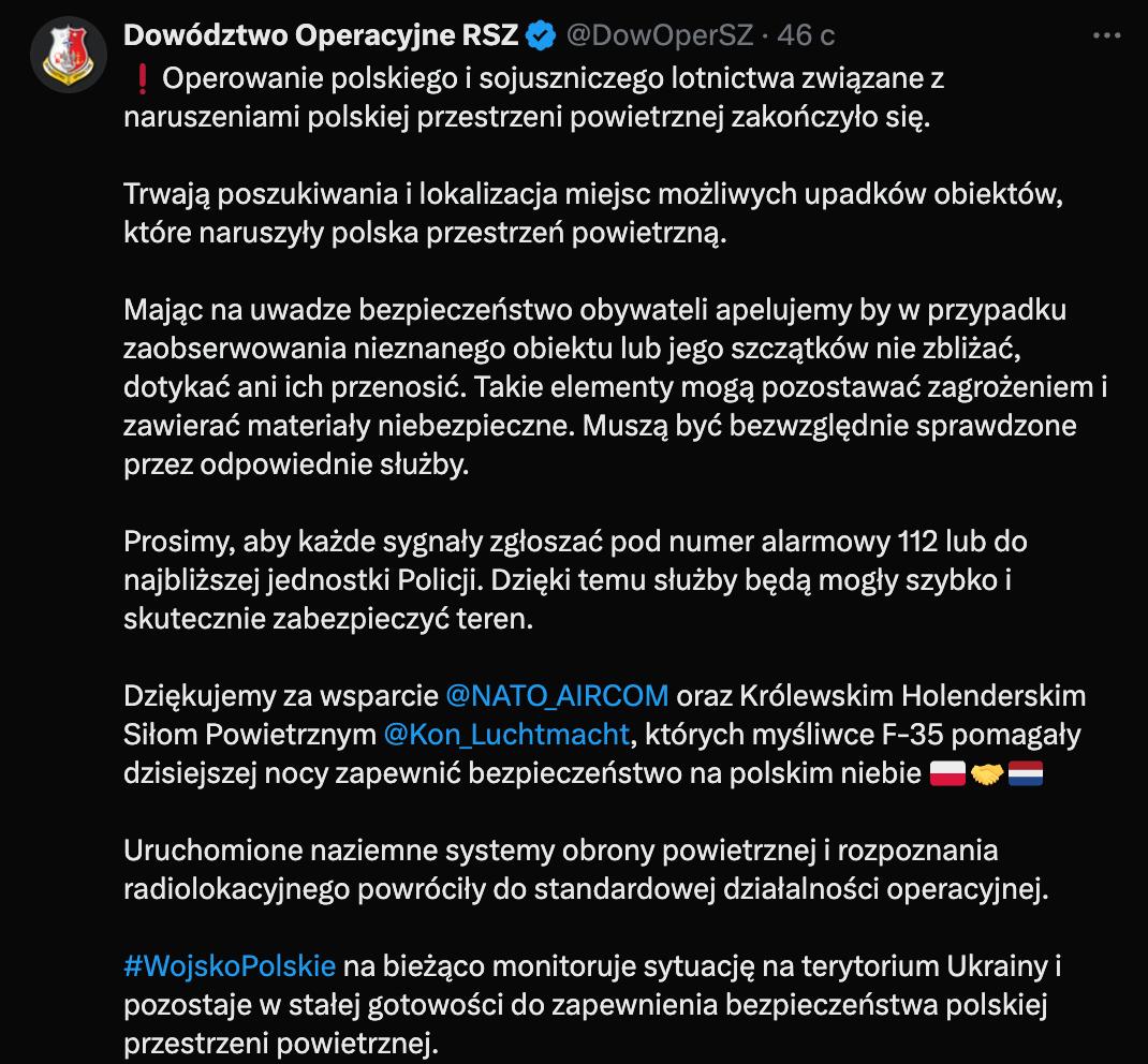"Операция польской и союзной авиации, связанная с нарушениями польского воздушного пространства, завершена. Продолжаются поиски и установление мест возможного падения объектов, которые нарушили польское воздушное пространство", - заявили в оперативном командовании.