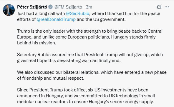 "Только что провёл долгий разговор с госсекретарём Марко Рубио, в ходе которого поблагодарил его за мирные усилия Дональда Трампа и правительства США. Трамп – единственный лидер, обладающий силой вернуть мир в Центральную Европу, и, в отличие от некоторых европейских политиков, Венгрия твёрдо поддерживает его миссию. Госсекретарь Рубио заверил меня, что президент Трамп не откажется от своих усилий, и это даёт настоящую надежду на то, что эта разрушительная война наконец может закончиться", – написал глава МИД Венгрии.