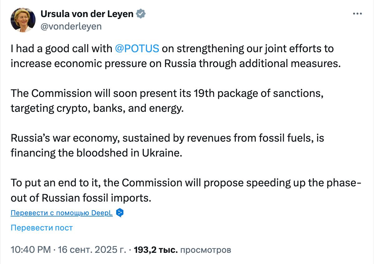 "Я провела конструктивную беседу с президентом США об усилении наших совместных усилий по увеличению экономического давления на Россию с помощью дополнительных мер. Комиссия вскоре представит 19-й пакет санкций, направленных на криптовалюту, банки и энергетику. Военная экономика России, поддерживаемая доходами от ископаемого топлива, финансирует кровопролитие в Украине. Чтобы положить этому конец, комиссия предложит ускорить отказ от импорта российского ископаемого топлива", - заявила глава Еврокомиссии.