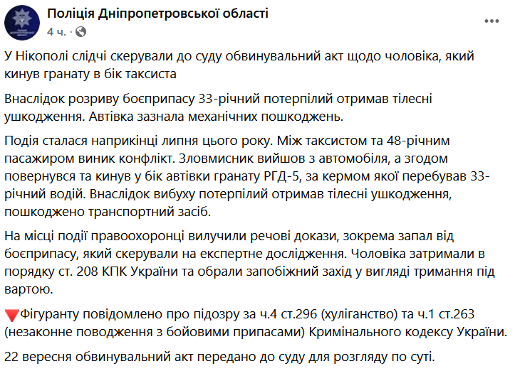 По информации правоохранителей, инцидент произошел в конце июля этого года. Между таксистом и 48-летним пассажиром возник конфликт. Злоумышленник вышел из автомобиля, а затем вернулся и бросил в сторону автомобиля гранату РГД-5. В результате взрыва пострадавший получил телесные повреждения, повреждено транспортное средство.