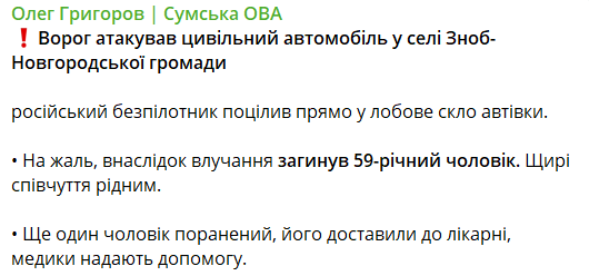 Военные РФ атаковали гражданский автомобиль в селе Зноб-Новгородской общины в Сумской области.