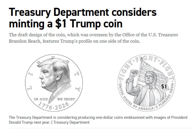 Казначейство США планирует выпустить монеты номиналом 1 доллар с изображением нынешнего президента Дональда Трампа. Согласно проекту, на монете может быть изображен сам Трамп с поднятым кулаком на фоне американского флага.