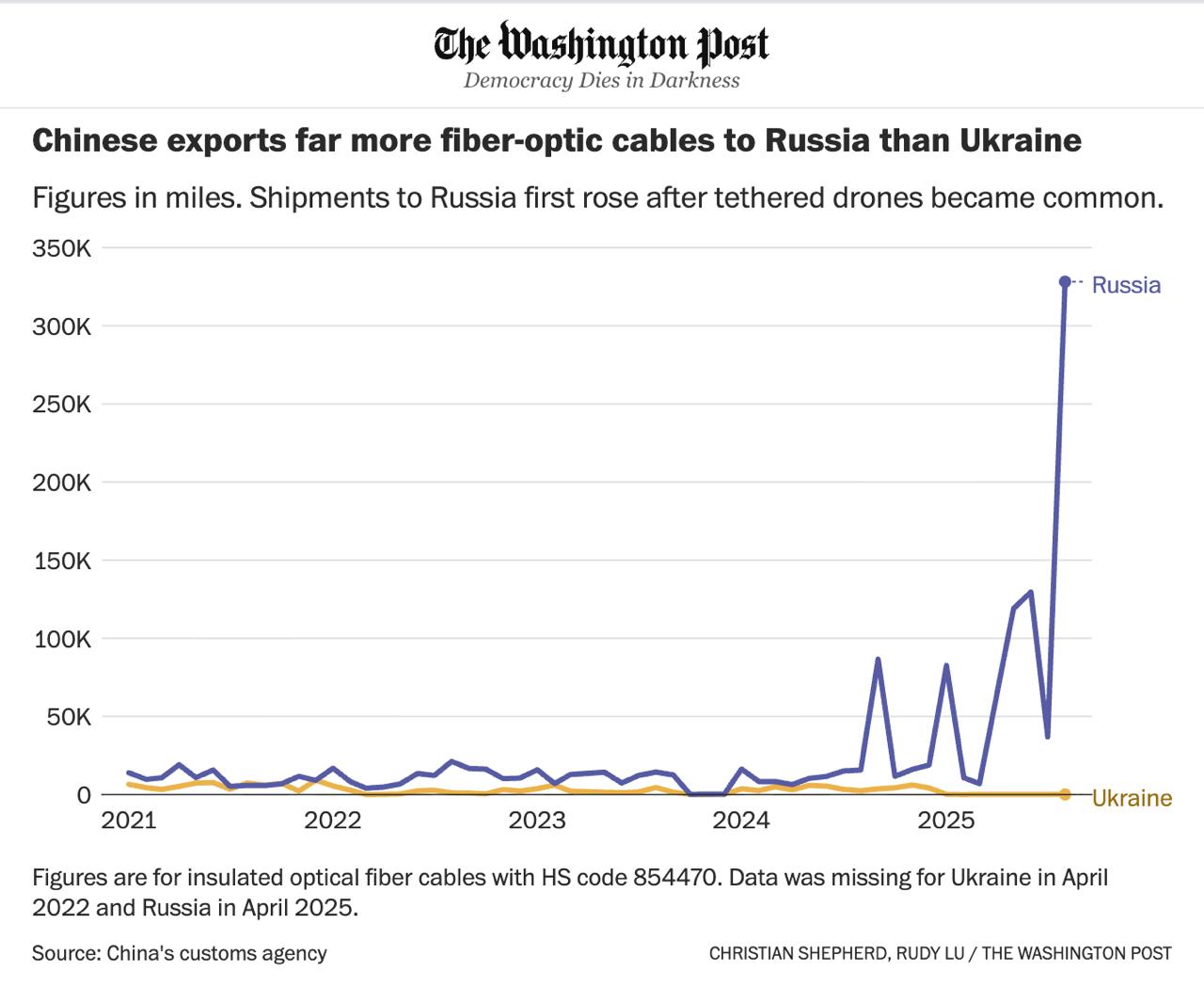 Китай за последние месяцы значительно нарастил экспорт в РФ компонентов, необходимых для производства оптоволоконных беспилотников, "которые позволили Москве сокрушить украинскую оборону на передовой".