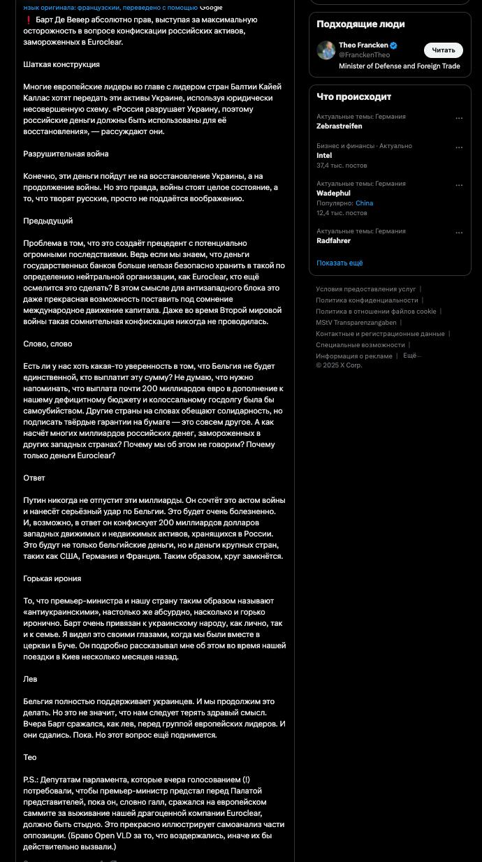 Министр обороны и внешней торговли Бельгии Тео Франкен выступил против передачи российских активов Украине.